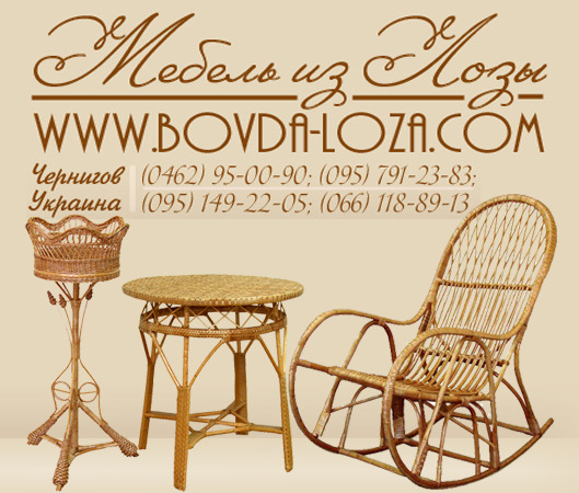 Предлагаем Вашему вниманию экологически чистую плетеную мебель из лозы с доставкой по Украине на www.bovda-loza.com г.Чернигов! Плетёная лозовая мебель для дома, дачи, сада, кафе, офиса. В ассортименте следующие изделия из лозы: кресла, кресла-качалки, столы, диваны, стулья, табуретки, корзинки, подставки и другие плетеные изделия из лозы. Доставка товара осуществляется во все регионы Украины: железной дорогой, автотранспортными компаниями («Автолюкс», «САТ») на Ваш выбор. |