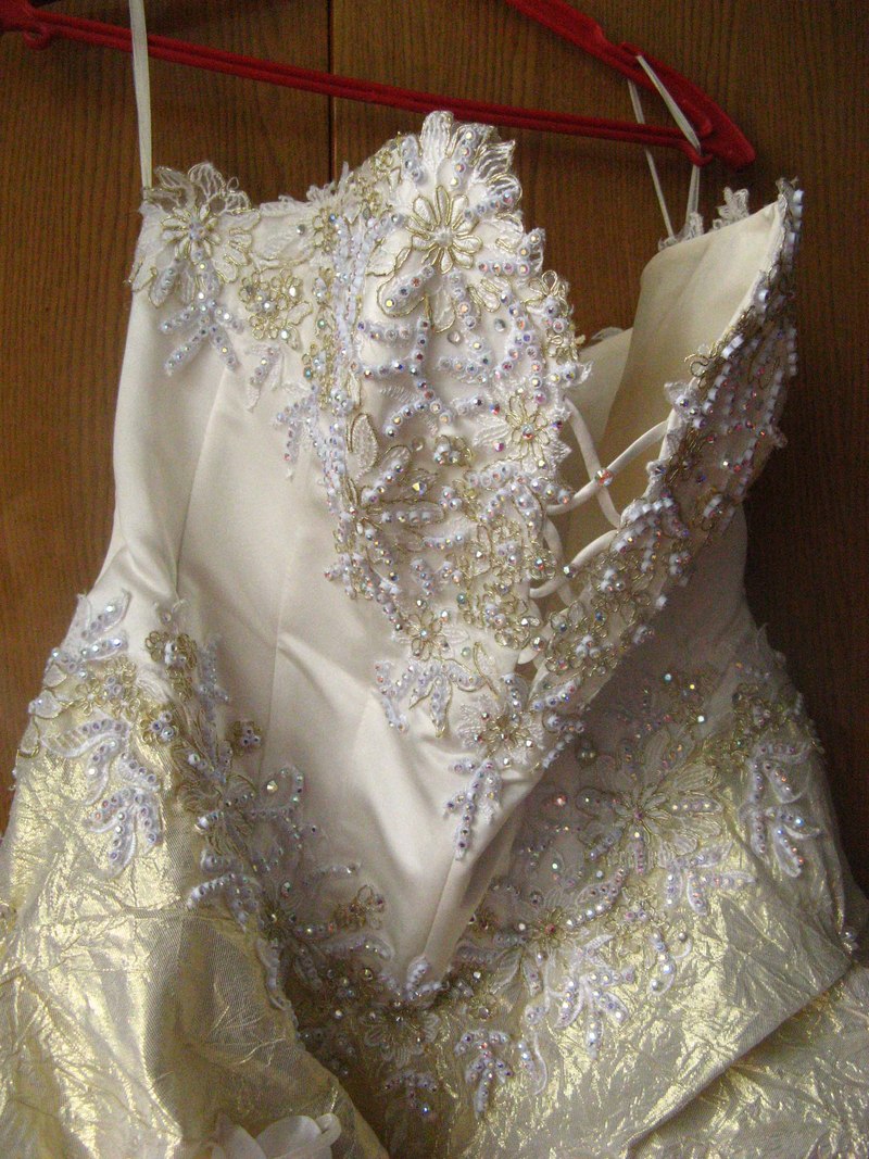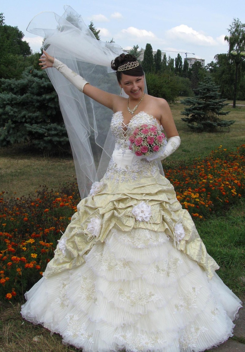 Платье б.у 1 день(одевала бы снова и снова, да некуда)))Не венчанное, легкое, скроит недостатки Вашей фигуры(на фото я на 5ом месяце беременности). Корсет подходит для груди от 2ого и до 5ого размера! Прекрасно держит грудь, не спадает как в некоторых платьях. Цвет шампань, золото. По платью стразы которые переливаются на солнце всеми цветами радуги! Очень пышное, много подъюбников. На рост от 164 см(с каблучком 5 см) до 175!