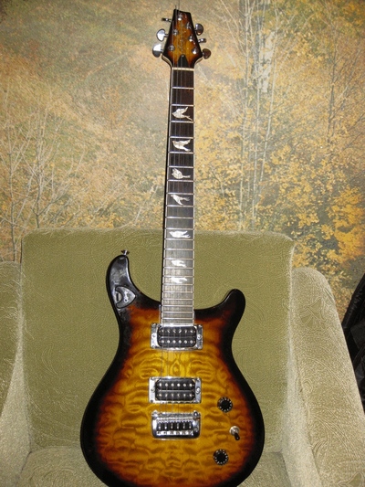Гитаре где-то два года.В хорошем состоянии.Отличная мягкая гитара для начинающего музыканта...Причина продажи - хочу инструмент более высокого уровня. ЦЕНА 1700грн. Конструкция: гриф крепится на болтах; Корпус: резонансное дерево; Гриф: канадский клен; Накладка грифа: индийский палисандр с белой окантовкой и инкрустацией в виде птицы; Мензура: 628 мм; 22 лада; литая механика; хромированная фурнитура; 2 хамбакера; тремоло классического типа с двумя опорными винтами; 1 регулятор громкости, 1 регулятор тона, 3-позиционный тумблер. |