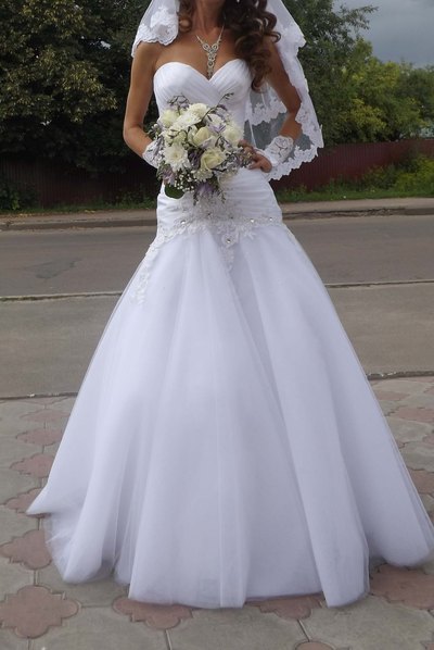 Продам оригинальное свадебное платье, которое выгодно подчеркивает фигуру невесты, белое, не венчаное, одето один раз. Корсет - атлас, низ - фатин, украшено вышивкой и стразами. Размер ориентировочно 44-46, регулируется молнией и шнуровкой. В подарок кольца и подъюбник. C Киева за 1,5-2 часа можно попасть на примерку, при покупке стоимость проезда компенсирую. Перешлю в любой город. Торг уместен. Также недорого продам фату и украшения. |