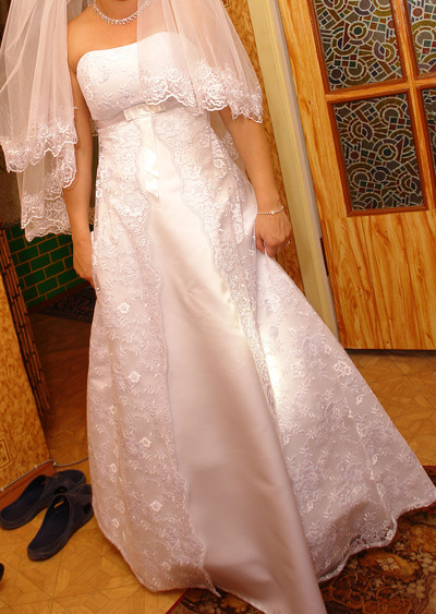 СРОЧНО! Продам свадебное платье на невысокую девушку, одето 1 раз, не венчанное; шубку. Украшение в подарок. |