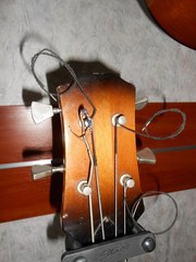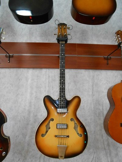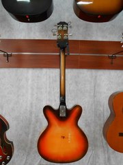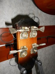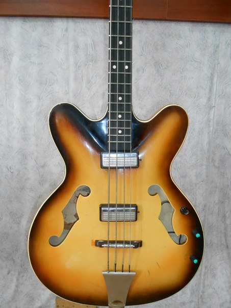 Полуакустическая Бас Гитара Мария. Мензура 760 мм, тип - полуакустика. Корпус склеен из белого листового полистирола толщиной три миллиметра. При этом верхней и нижней декам придан необычный рельеф. Помимо общей «арктоповости» корпуса, каждый рог представляет собой отдельный маленький «арктоп». Внутри корпус усилен тремя деревянными пружинами. Две на верхней и одна на нижней деке. Обечайка также усилена дополнительным слоем полистирола. Поэтому Гитара намного крепче чем можно предположить)) В верхней деке вырезаны широкие эфы грубоватого, на мой взгляд, вида. Но именно их ширина сильно облегчает монтаж электроники в корпусе. Покрашен корпус в яркий, праздничный оранжевый «бёрст». Верхняя дека имеет белый кант что добавляет гитаре стильности и элегантности! Подвес для струн по конструкции аналогичен подвесам на шести- и двенадцатиструнных сестрёнках, установлен подвижный бридж, состоящий из деревяного основания и подвижной части, и металлического порожка круглого сечения. Бридж удерживается натяжением струн, регулируется по высоте. Система кольцеобразных насечек на порожке позволяет варьировать расстояние между струнами и это Огромный плюс для Бас Гитары. Гриф у Марии из трёх кусков бука. Внутри имеется рабочий анкер. Доступ к гайке анкера со стороны головы. Ширина грифа 42 миллиметра в районе первого лада и 48 в районе двенадцатого. Толщина 24 миллиметра у первого лада и 29 у одиннадцатого (в районе двенадцатого уже начинается пятка). Крепится гриф через металлический некплейт пятью мощными шурупами, так что в надежности крепления можете не беспокоиться! Накладка из бука окрашена в чёрный цвет и содержит двадцать ладов плюс нулевой. Лады тонкие и низкие, к несчастью, познавшие очень близкое знакомство с напильником. Маркеры круглые из белой пластмассы. Голова грифа широкая лопатообразная, с колками на две стороны 2+2. Гайка анкера прикрыта кривоватой чёрной пластмассовой крышечкой. Колки открытые, обычные для советских бас-гитар. После тщательной подгонки деталей почти лишаются люфта. Электрическая часть Марии включает в себя два датчика сингла, единых для всего комплекта, и простейший темброблок. Принципиальная схема проста и надёжна. Регуляторы громкости для каждого датчика и общий тембр, который на практике лишь убирает высокочастотный фон. Датчики в металлических корпусах, с крышечками-«тёрками» установлены в чёрных пластмассовых рамках. Датчики удерживаются в рамках при помощи винтов. Гнездо перепаяно под Джек, поэтому ее можно подрубить к современным Комбарям и это Огромный плюс для Гитары, так как гнездо пятерочка СССР уже практически ни кем не используется. В неподключённом состоянии Мария в состоянии издавать низкий звук, о котором можно сказать лишь то, что он громче, чем у других неподключённых советских бас-гитар. Однако, при подключении, Мария выдаёт глуховатый, но довольно приличный, по советским меркам, бас. Лично я настоятельно рекомендую эту яркую и привлекательную красотку в каждую, уважающую себя коллекцию, а также тем, кто берет для себя первую Бас Гитару, так как для Репетиций это именно то что нужно, и по цене очень даже хороший вариант!