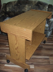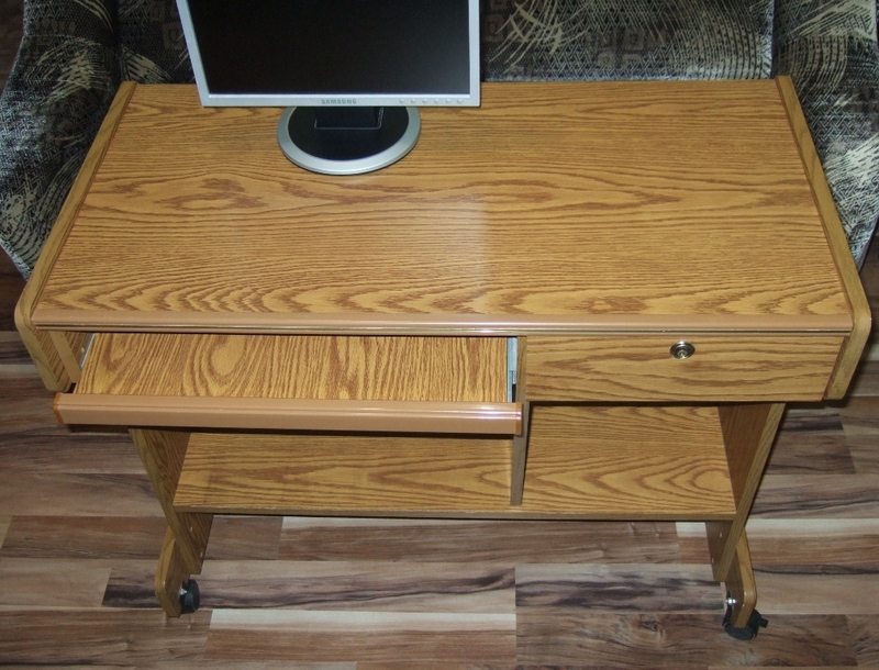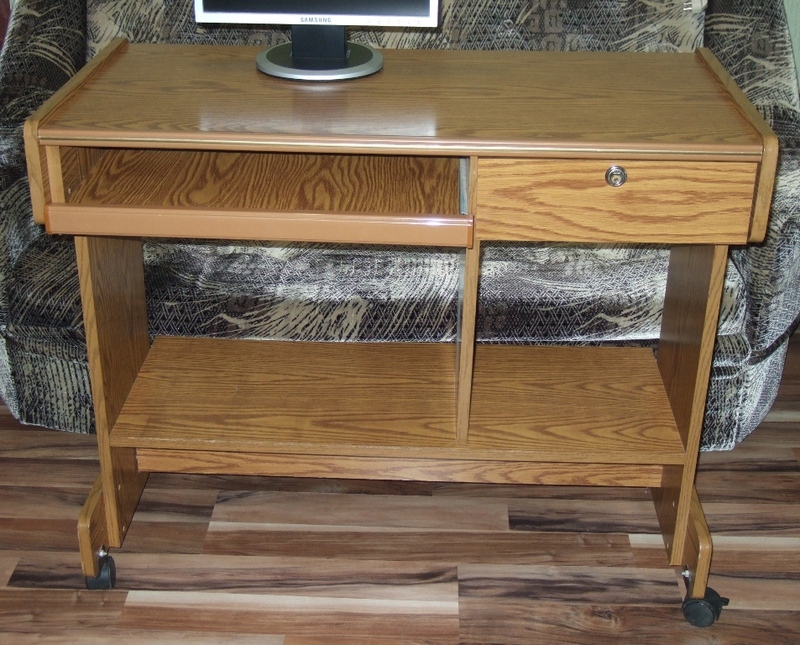 Стол компьютерный на колесиках с фиксаторами(тормоз). Легко передвигается и очень устойчивый. Высота 80см. Ширина 99см. Глубина 50см. Высота полки для ПК 40см. Выдвижной ящик на замке. |
