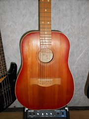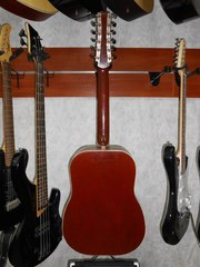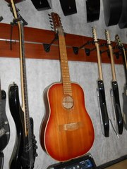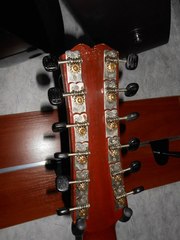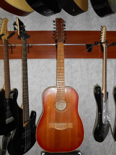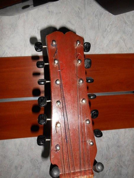 Гитара Черниговской музыкальной фабрики, 12 струнная, Концертная (к концертным гитарам производитель относился более скурпулезно, очень проработаны детали как технологии производства так и внешнего вида, поэтому она намного качественнее чем другие Черниговские гитары), стоят 12 колков в идеальном состоянии, строй держат Отлично, акцент хочу сделать на расстоянии, которое отрегулировано как от струн до грифа в районе 12 лада, так и от края грифа до 12 и до 1-ой струн, на втором фото это все видно, на столько ювелирная работа что просто нет слов! Верхняя дека сделана не из фанеры, как часто бывает у подобных гитар, а из цельного массива Ели, поэтому звучание намного чище и более глубокое, и именно по этой причине от времени склейка такой древесины начинает рассыхаться и образуются мини трещинки на местах склейки, данная гитара тоже столкнулась с этой проблемой и Наши мастера качественно проклеили их, так что теперь можно не беспокоиться об этом)) Гитара Очень звонкая, стоят Металлические струны, внешний вид видно на фото, Сейчас гитара 12 струнная, при желании можно будет снять дополнительные струны и гитара превратиться в Шестиструнку, более того, у Вас останется 6 запасных колков и это Огромнейший плюс для Гитары! Идеально подойдет для тех, кто раньше играл на 6-струнной гитаре, а потом решил попробовать поиграть на 12 струнке, если Вы думаете что это совершенно другой инструмент (как 6-струнка и 7-струнка), то глубоко Ошибаетесь, фактически играя на 12-струнной гитаре Вы зажимаете те же аккорды (переучиваться ничему не нужно из-за большего количества струн, их зажимать также удобно только по началу немного не привычно), а звук извлекаемый из гитары получается более Глубокий, более чище, потому что первые четыре струны звучат в унисон по-парно, а дополнительные верхние струны добавляют "высоту" звучанию потому что строятся на октаву Выше. Настройка двенадцатиструнной гитары почти не отличается от настройки обычной шестиструнной. Основные струны настраиваются как на шестиструнной гитаре. Первая и вторая дополнительные струны настраиваются в унисон с основными струнами, а остальные — на октаву выше. Данная гитара отлично подходит для аккомпанемента, из-за чего любима бардами во всем мире. Не рекомендуется начинать обучение именно с двенадцатиструнной гитары. Она имеет характер дополнительного инструмента, поэтому предварительно необходимо освоить технику аккомпанемента на шестиструнной гитаре какого-либо вида или в начале обучения просто снять дополнительные струны!