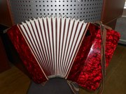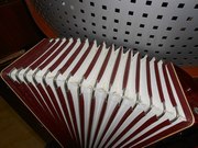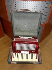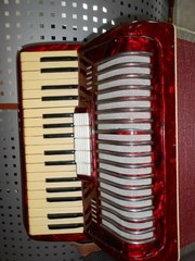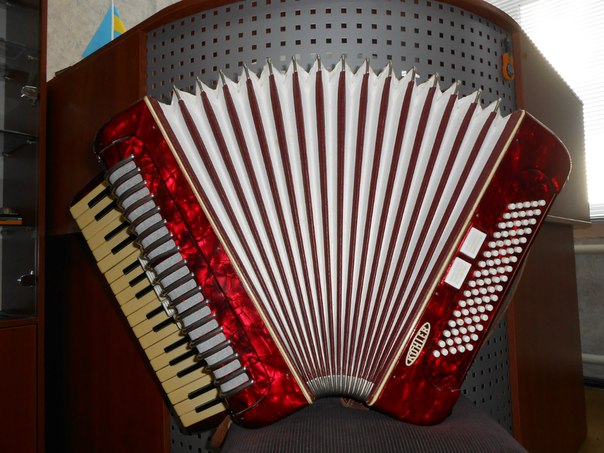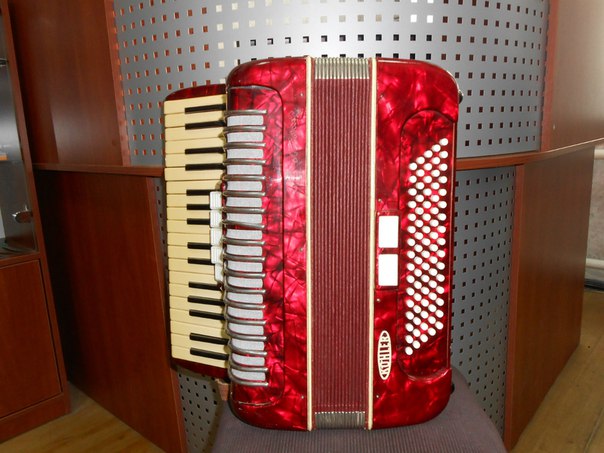 Аккордеон полный, концертный, Имеет 34 клавиши справа, 80 клавиш слева. 5 регистров справа, 2 регистра слева. Размеры: Высота 42 см, ширина 38 см, ширина по меху 18,5 см.