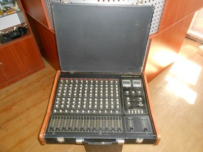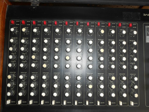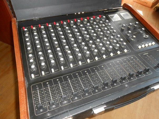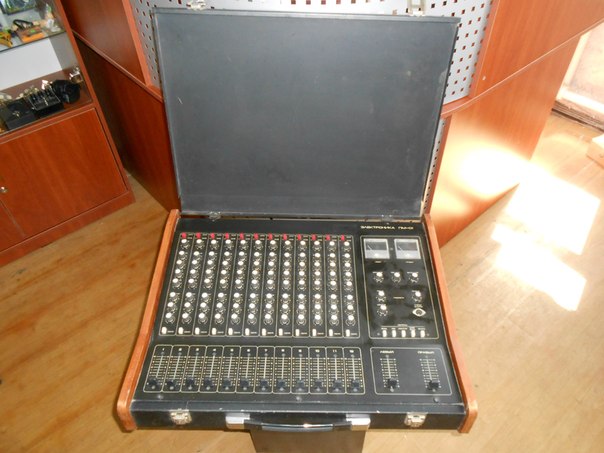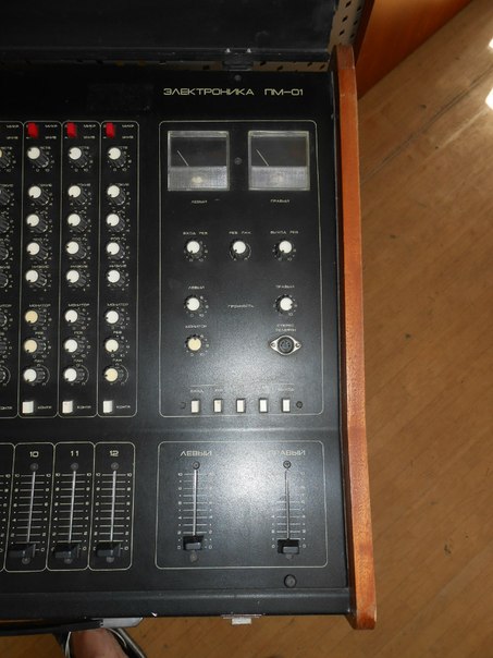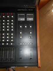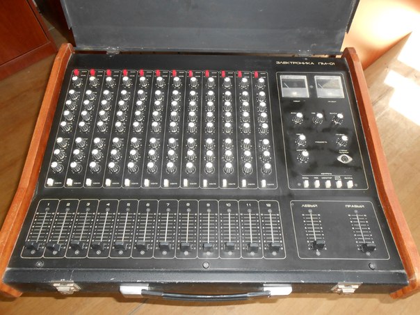 Легендарный Микшерный Пульт Электроника ПМ-01, позволяет вести высококачественное управление сигналами двенадцати источников звука (микрофонов, ЭМИ и т.п.), а также осуществлять четырехполосную регулировку тембра сигнала, по каждому из источников, смешивать сигналы в каждом из двух каналов и усиливать их до величины, необходимой для работы усилителя мощности. Пульт собран на 32 интегральных микросхемах, прост в обращении и обслуживании, прост в ремонте. Диапазон рабочих частот пульта, - 10...25 000 Гц. Коэффициент нелинейных искажений вносимых пультом - 0,018 %, Потребляемая мощность - 40 Вт. Габаритные размеры - 640x510x150 мм. Масса - 12 кг. Складывается в очень удобный чемоданчик что упрощает его транспортировку, имеет удобную прорезиненную ручку для транспортировки в руке.