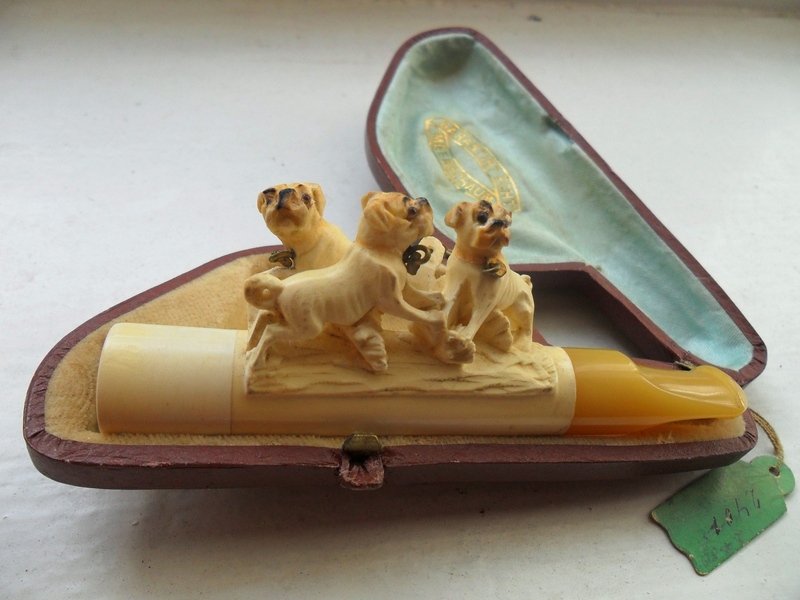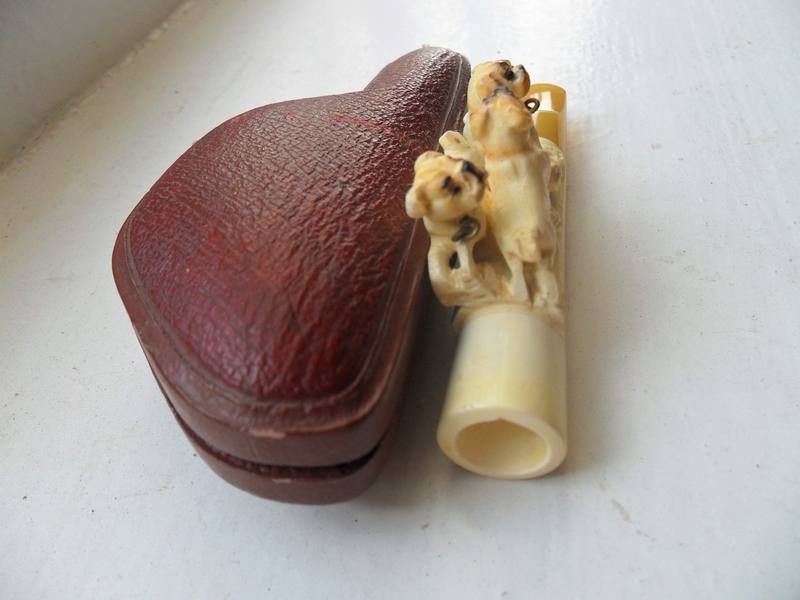 На мундштуке вырезаны в ручную три собачки, на грудях которых кольца с бирками - смотрится очень элегантно и красиво!.