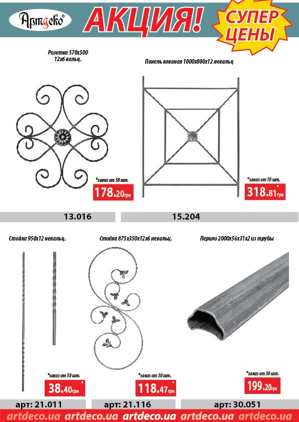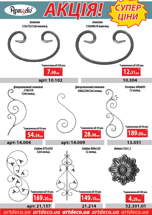 Кованные изделия по акционой цене, скидки до 30% только в Январе. Цена актуальна при покупке товара в количестве, указанном в листовке. Товар продаем без покраски. Отправляем во все регионы Украины. |